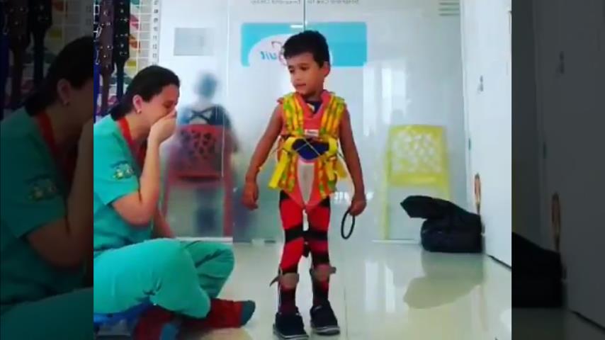 物理治疗师做治疗,残疾儿童, 尤其是移动的时候,男孩后管理大力气走路. 该事件发生在巴西的一家理疗诊所.