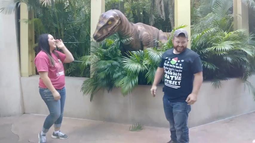 主题公园环球公司在佛罗里达州奥兰多环球电影公司的冒险岛, 女人想摆姿势拍照恐龙旁边.