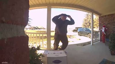 一名男子一边吃饭一边开车, 非常放松, 一辆货车勉强减速. 评论和声音由 Steve Inman 添加.
