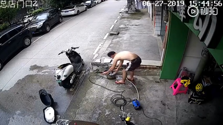 一名男子将被流来袭,因为它抓住把手的压力水用左手. 所述主体部分瘫痪, 手臂肌肉合同,不能离开手柄的手. 与过劳, 设法在地面上爬行在插座的方向切断装置在他的右手, 趁早.