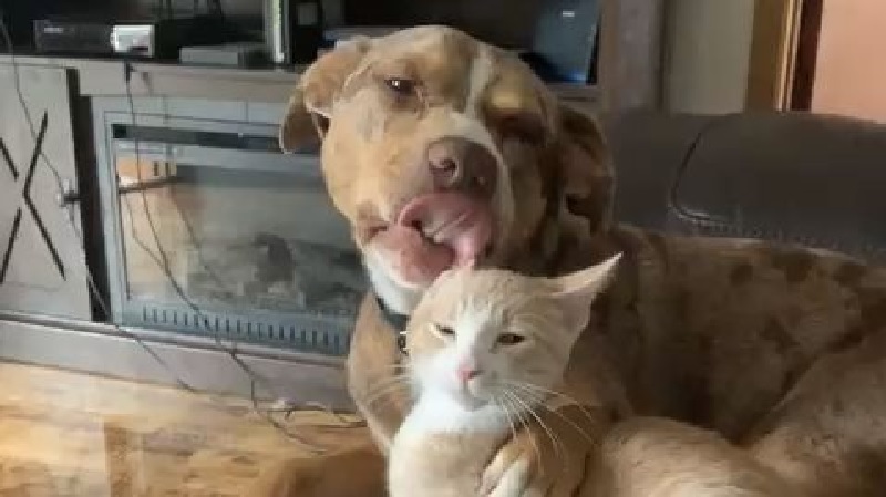 坐在沙发上, 狗显示了他的爱猫舔头. 狗似乎很喜欢猫, 但也许是太. 有时会打开他的嘴,并通过猫把他的头,仿佛吃.