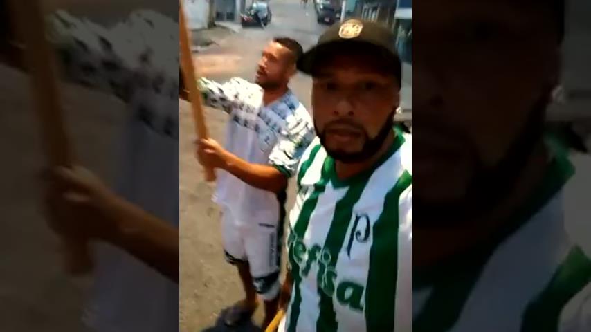 在巴西, 两个足球迷想在镜头前庆祝,拿着简易的烟火.
