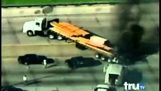 两个玻璃清洁剂位于建筑物前的高处, 他们的平台被强风吹走了.