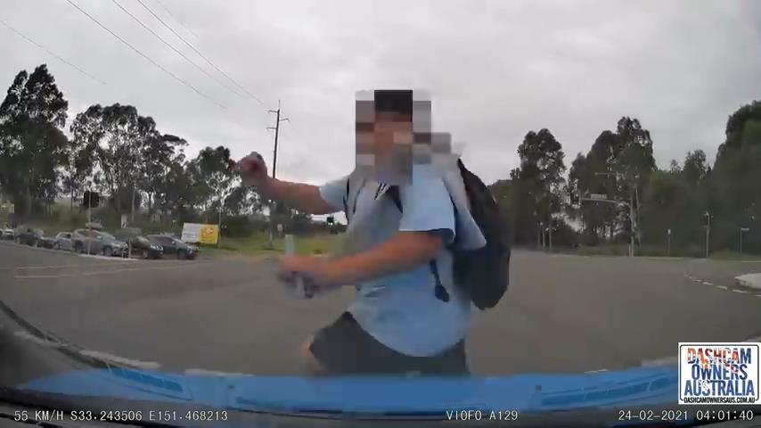 在澳大利亚新南威尔士州, 由于某种未知的原因,一个学生决定闯红灯过马路. 虽然他被车撞了, 他很幸运. 汽车行驶得比允许的慢 (70公里/小时) 司机还有时间刹车. 这个男孩没有受重伤.
