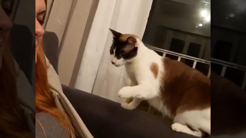 一只猫走近她在家里第一次见到的陌生女人. 他会试着用她的脚把她推开, 但女人会用可怕的“嘘”声进行反击.