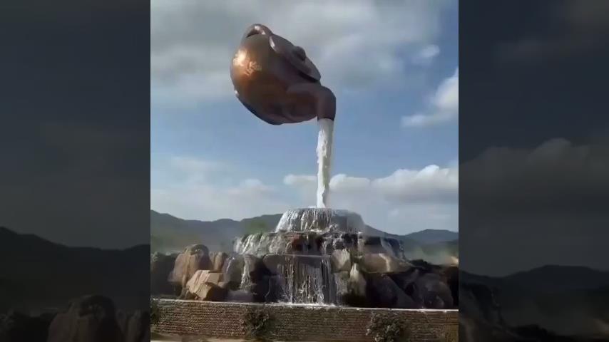 带有巨型浮动茶壶的喷泉, 位于中国贵定县.