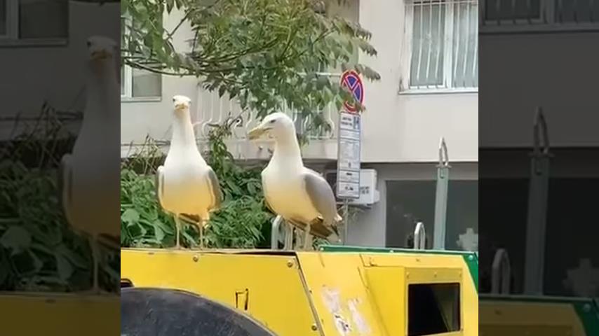 数百名搭乘一艘商船在波兰休息的海鸥. 看到船长使用喇叭时,会发生什么.