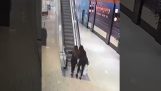 2022年9月25日星期日,中国上海, 一名小女孩被发现吊在商场自动扶梯上数米高的地方. 他抓住了自动扶梯的扶手, 然后将她带到顶部,女孩将自己楔入玻璃墙和楼梯之间的缝隙中. 两名男子随后介入,抓住她并将她带到安全的地方.