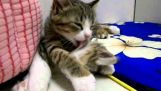 Toby, 两个月的小 skioyropithikos, 在水池里让他第一次洗浴, 写在他的手上...