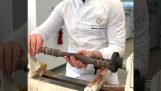 这位厨师以令人印象深刻的速度和准确性的洋葱砍洋葱.