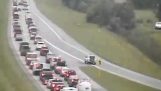 在2018年9月8日在野人,明尼苏达州, 一辆颠覆性卡车落在高速公路上的三辆固定汽车上....