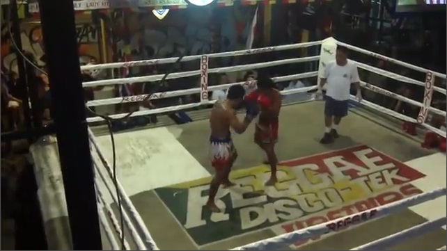 两名运动员在泰国面临充满惊喜的比赛跆拳道. 不幸的是,这不是一场真正的比赛, 但他的节目作酒吧'雷鬼摇摆乐栏'上岛的皮皮岛,泰国的访客.