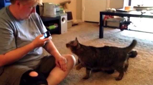 一个女人试着在手机上使用的应用程序, 这被应该翻译到喵的人类语言. 那只猫会接近暴露的神经,将攻击.