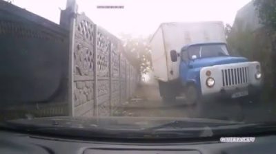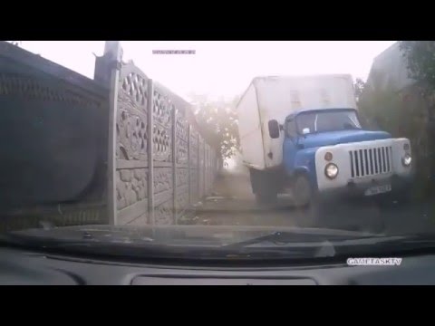 在一条狭窄的双向街道在俄罗斯, 做在边缘上,当他看到了一辆卡车向走来的女人. 卡车将能够通过边缘, 但最后一次的卡车后挡板突然打开, 造成轻微事故.