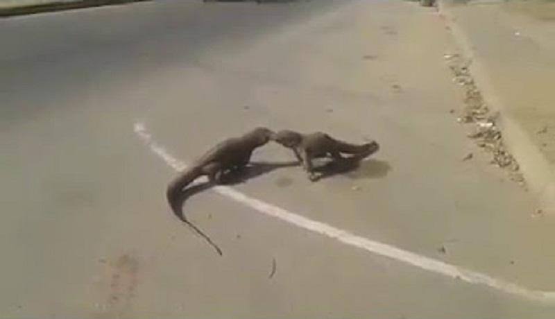 两个大蜥蜴 (科莫多龙) 他们与句柄古典式摔跤决斗, 在印度尼西亚繁忙的街道上.
