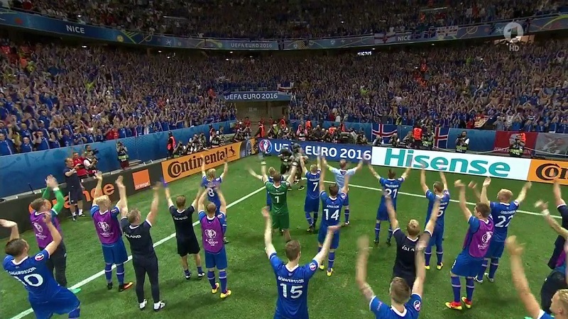 2016年6月27日,星期一, 冰岛队晋级2016年欧洲八强, 2-1击败英格兰. 在 Felix Bollaert 体育场, 冰岛人球员聚集在一起,和他们的球迷一起庆祝胜利, 有节奏地敲打他们的手和破坏大声的喊叫,像维京人.