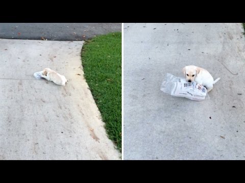 这持续的小狗拒绝被打败时取一份周日报纸她大小的几乎两倍.