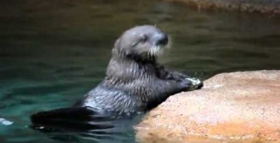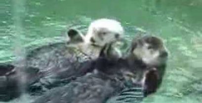 两只水獭放松手牵手在温哥华水族馆游泳, 在加拿大.