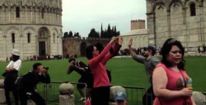 一群朋友 trolarei 游客到比萨斜塔, 当他们试图为我们都见过的非常普通的“阻止塔楼倒塌”照片表明立场的那一刻.
