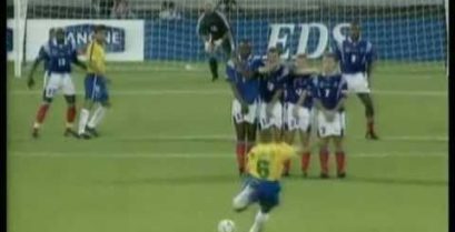 1997 年对阵法国队时,罗伯托·卡洛斯打进令人惊叹的直接任意球进球