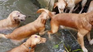 十六黄金猎犬游泳与他们的主人, 在夜功府,泰国省.