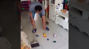 虽然打扫房间, 一个人会牺牲品恶作剧. 俄罗斯套娃的躺在地板上轨道, 并且将被迫通过一个接他们一个.