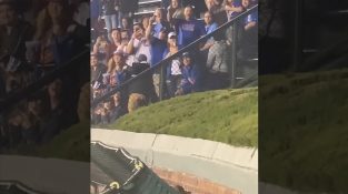 在棒球场箭牌场在芝加哥的球迷, 鼓掌老鼠的努力跳下间距.
