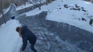 一个人为了结冰的路面浇筑盐从车库去除车内安全. 你可能会需要一个更大的容器.