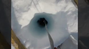科学家研究气候变化对南极冰盖的影响, 他们提出在Filchner - 龙尼冰银行非常深的洞. 一种照相机降低到孔中,创建一个催眠视频.