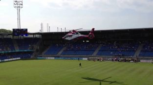 直升机从体育场的运动场起飞, 相机的帧数/秒与螺旋桨的转速相同.