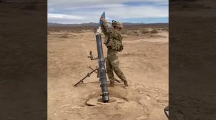 砂浆在慢动作中的镜头. 射程可达5公里的武器, 取决于使用的壳体和坡度.