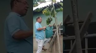 一名男子试图移走黄蜂巢, 装在袋子里. 黄蜂似乎不同意这个想法.