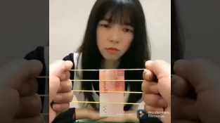 一个男人向我们展示了一张折叠钞票的魔术, 它被“传送”到他手指之间的一根拉伸的橡皮筋上.