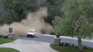 一辆车从山顶下来, 在不平坦的地面上多次猛烈碰撞后最终上路.