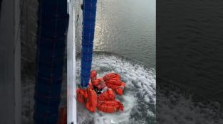 在游轮上测试乘客救援系统, 由 4 艘大型自动充气救生艇和两条软管组成,用于快速疏散船只. 四艘船可以承载 [...]