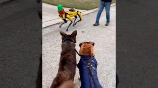 两只狗遇到波士顿动力的机器狗 Spot 时的反应.