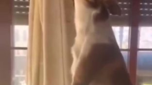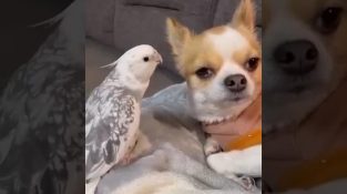 一只鹦鹉在一只明显生气的吉娃娃旁边唱着“三角颂歌”.
