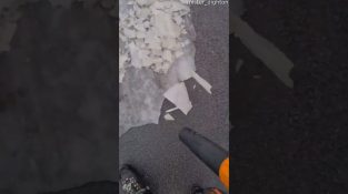 一名英国男子清理他家门外结冰的道路, 使用强力鼓风机. 冰块很容易从路上脱落, 在压缩空气的帮助下.