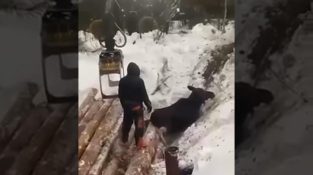 一群伐木工人营救了一只被困在砍伐树木树干中的驼鹿.